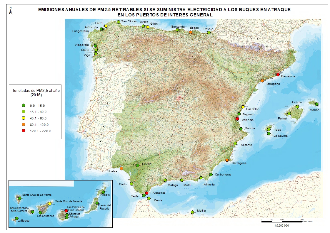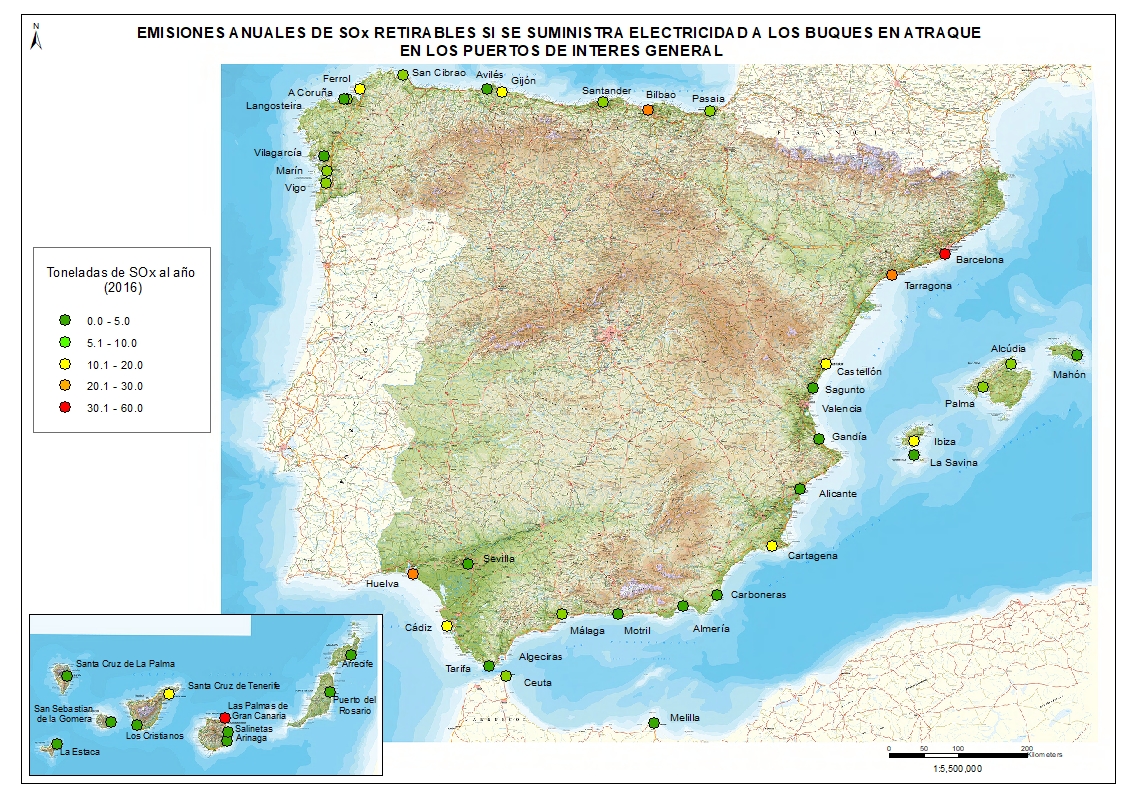 CO2, NO2, SOx, PM10 and PM2,5 annual tons that could be removed of the atmosphere in case ships at berth were be supplied with energy from the onshore electric grid in the Spanish Ports of Interest.